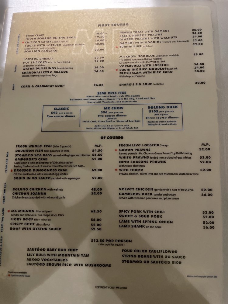 “ I see all the bad reviews on here, I think it's because they were less than desirable people that went there and may have been asked to leave. I saw many VIP's dinning at this venue when I last went there on election night. I must say I loved the place. I think they need to make their valet more visible that might help some of their customers. I'm treated like a king when I come here, and I always leave satisfied. P.S we are here to review Mr. Chow's the restaurant, Not Michael "M" Chow or the documentary he was in. Thank you! ”